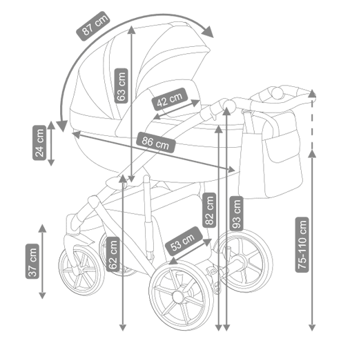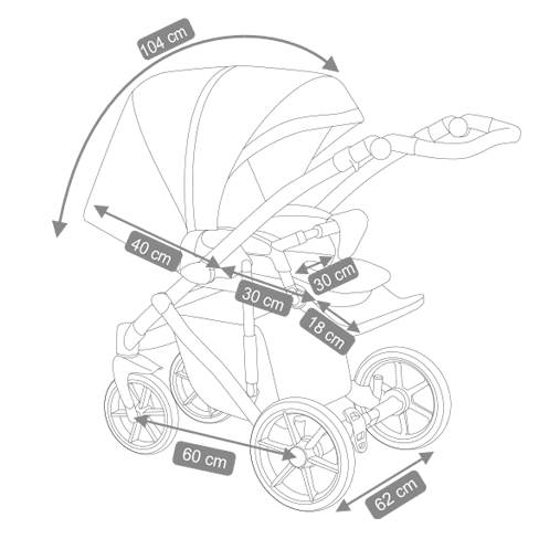 Rozměry: vanička-vnitřní část 86 cm x 38 cm, vanička-vnější část 88 cm x 42 cm (d,š), délka sportovní části 100 cm, nastavitelná rukojeť 74 cm-111 cm, složená konstrukce s koly 82 cm x 60 cm x 30 cm (d,š,v)