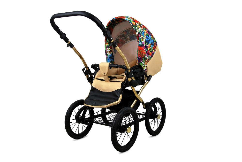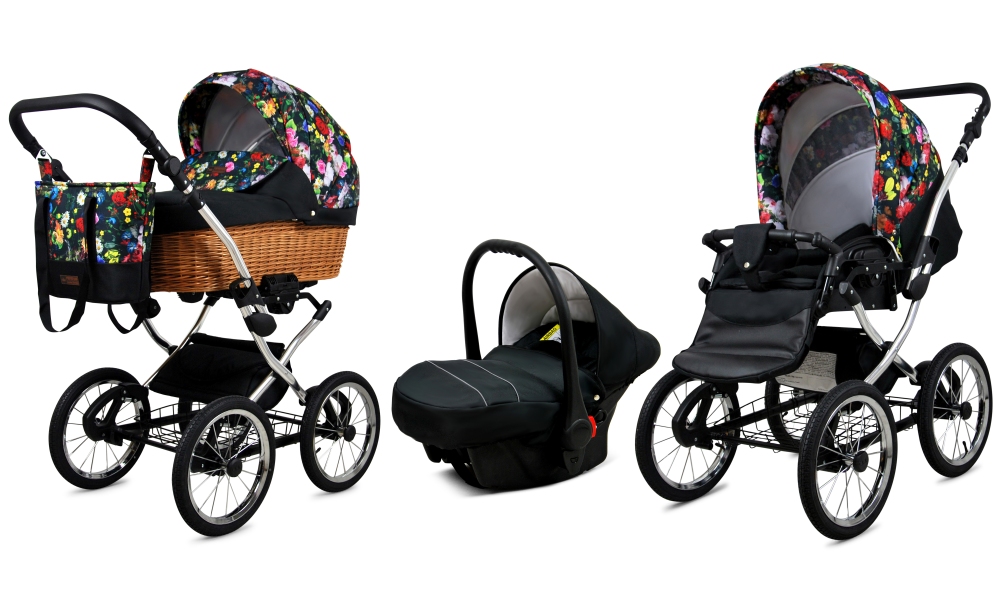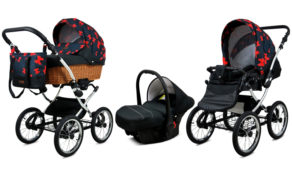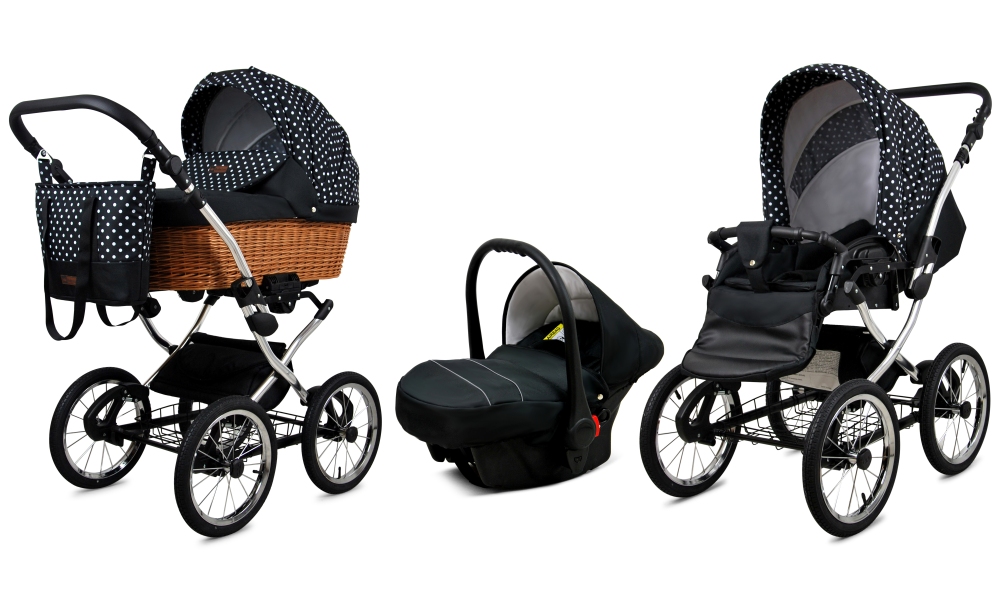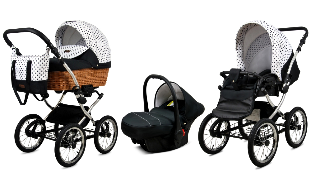 Klasický kočárek RAF POL BABYLUX CLASSIC na hliníkovém podvozku ve stříbrné barvě a s autosedačkou v ceně.