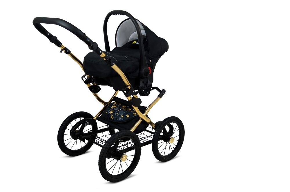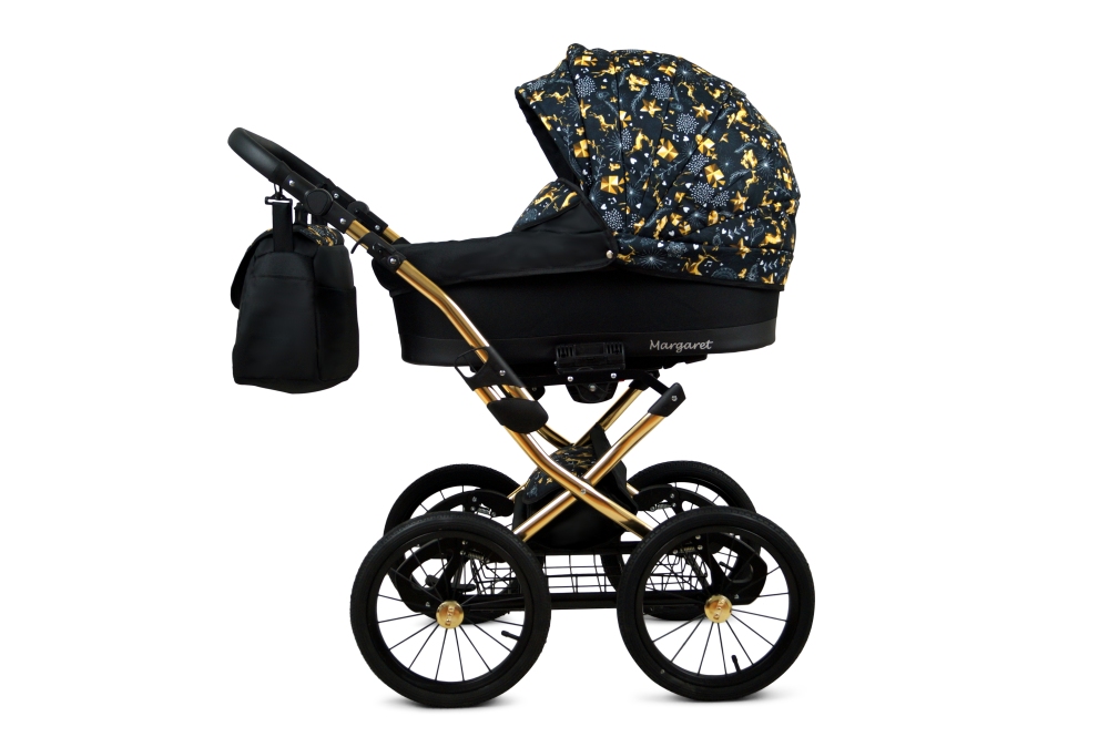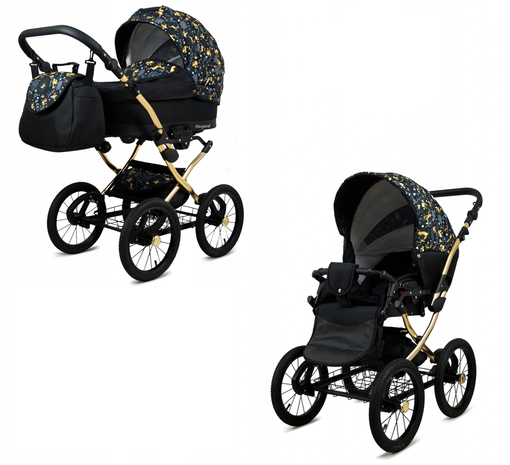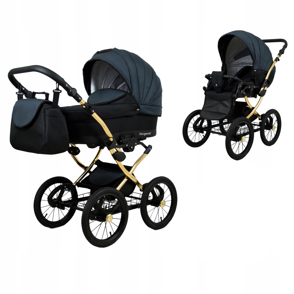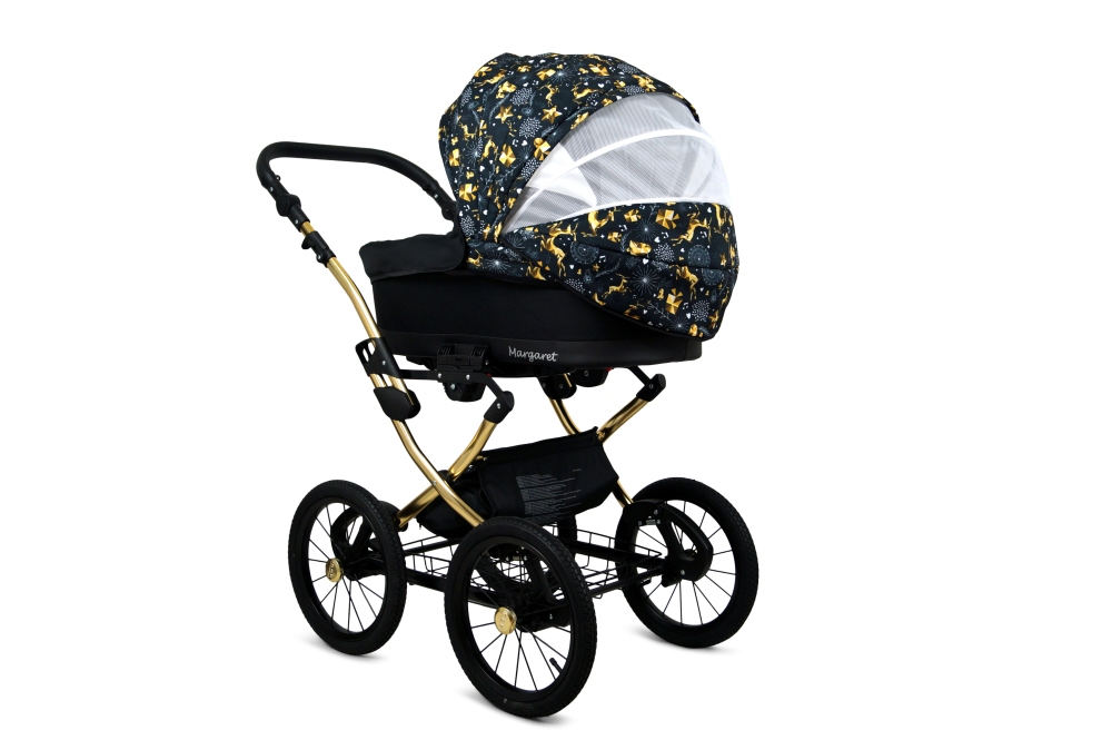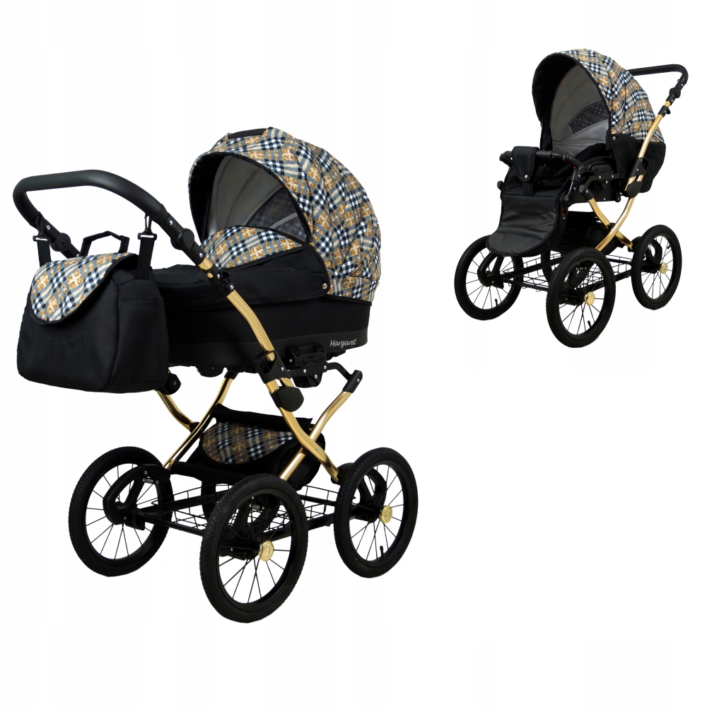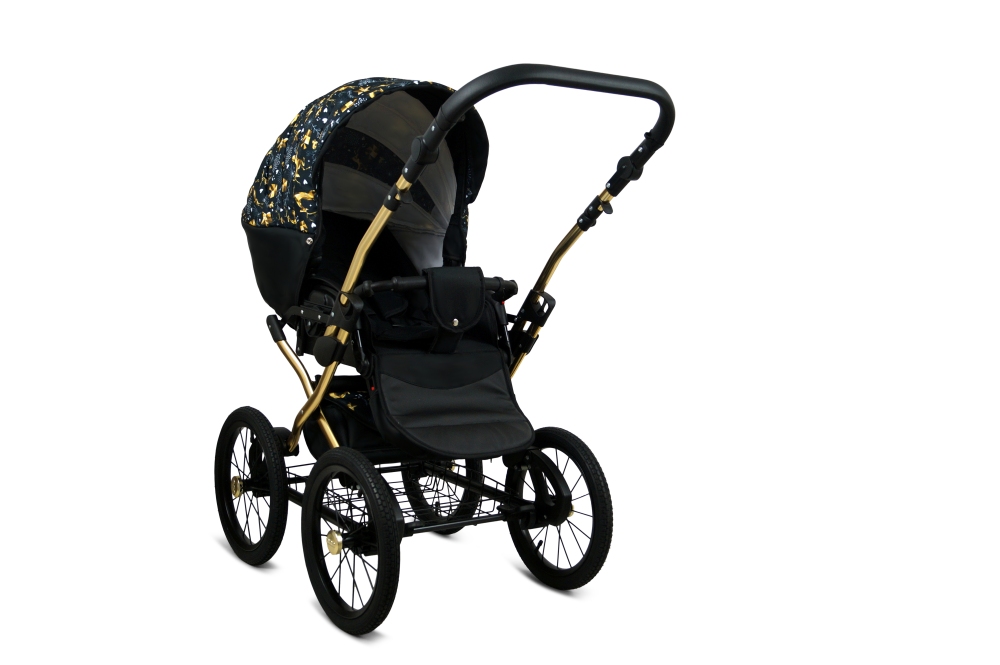 Klasický kočárek RAF POL BABYLUX MARGARET na hliníkovém podvozku ve zlaté barvě. Kočárek je prodáván jako dvojkombinace, lze dokoupit autosedačku.