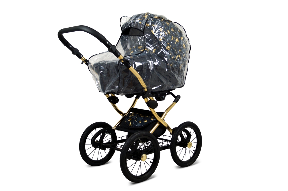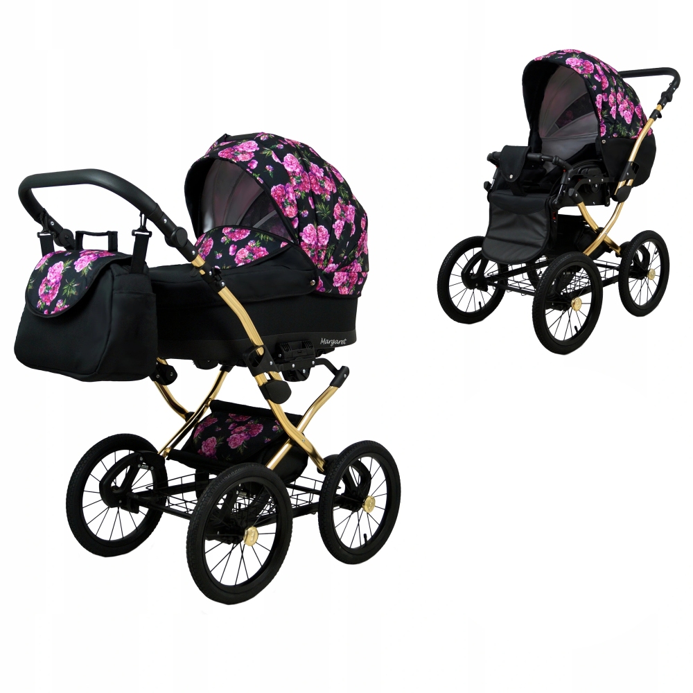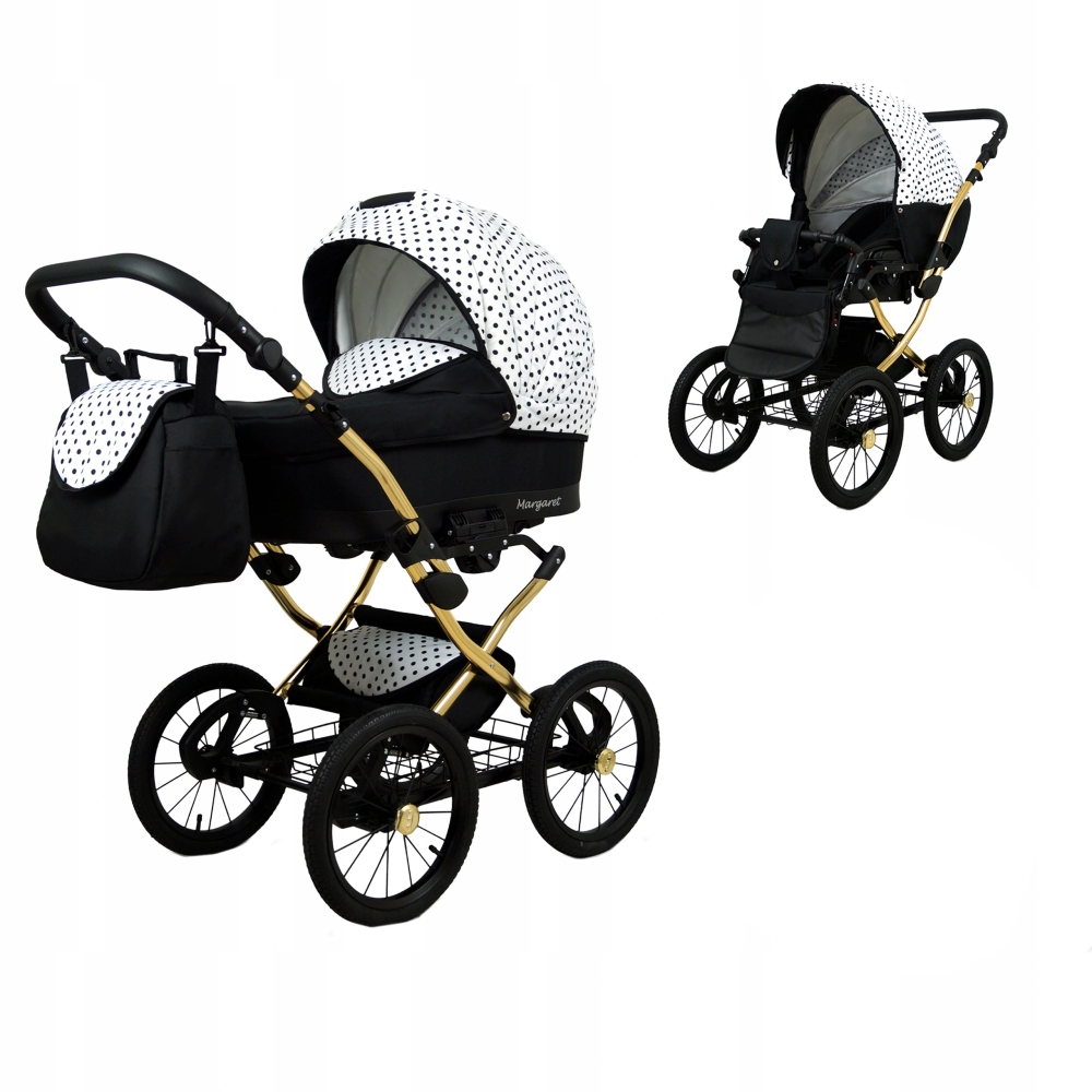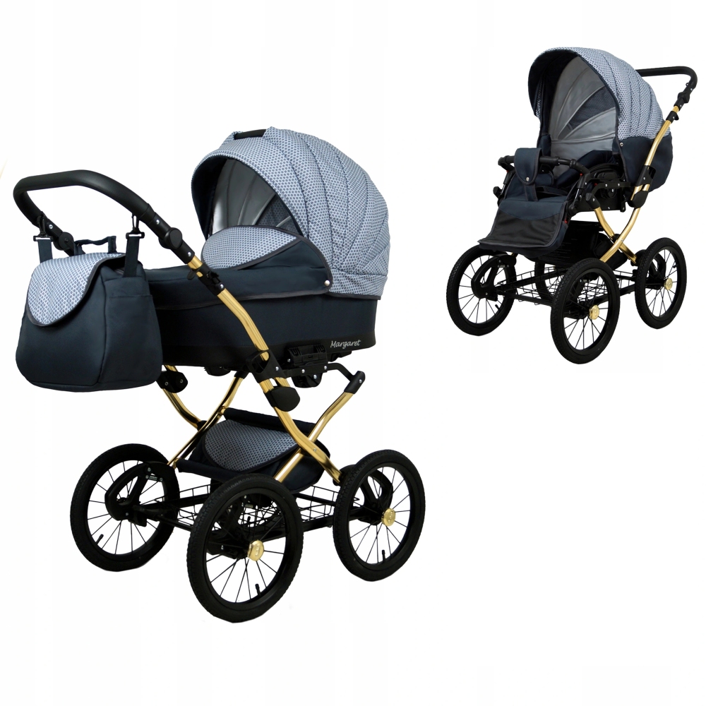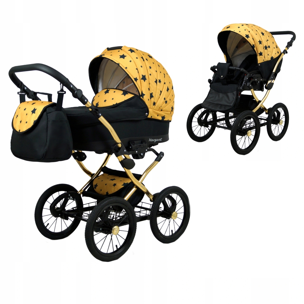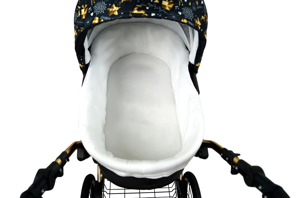 Klasický kočárek RAF POL BABYLUX MARGARET na hliníkovém podvozku ve zlaté barvě. Kočárek je prodáván jako dvojkombinace, lze dokoupit autosedačku.