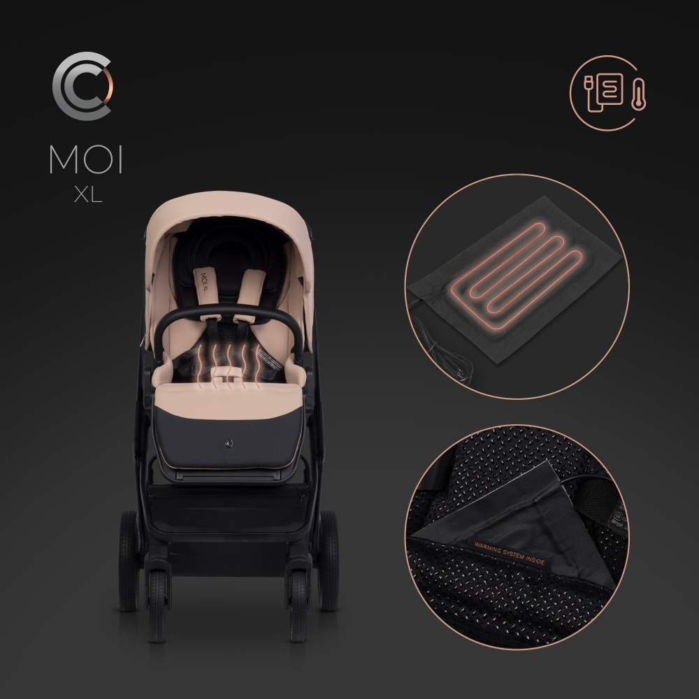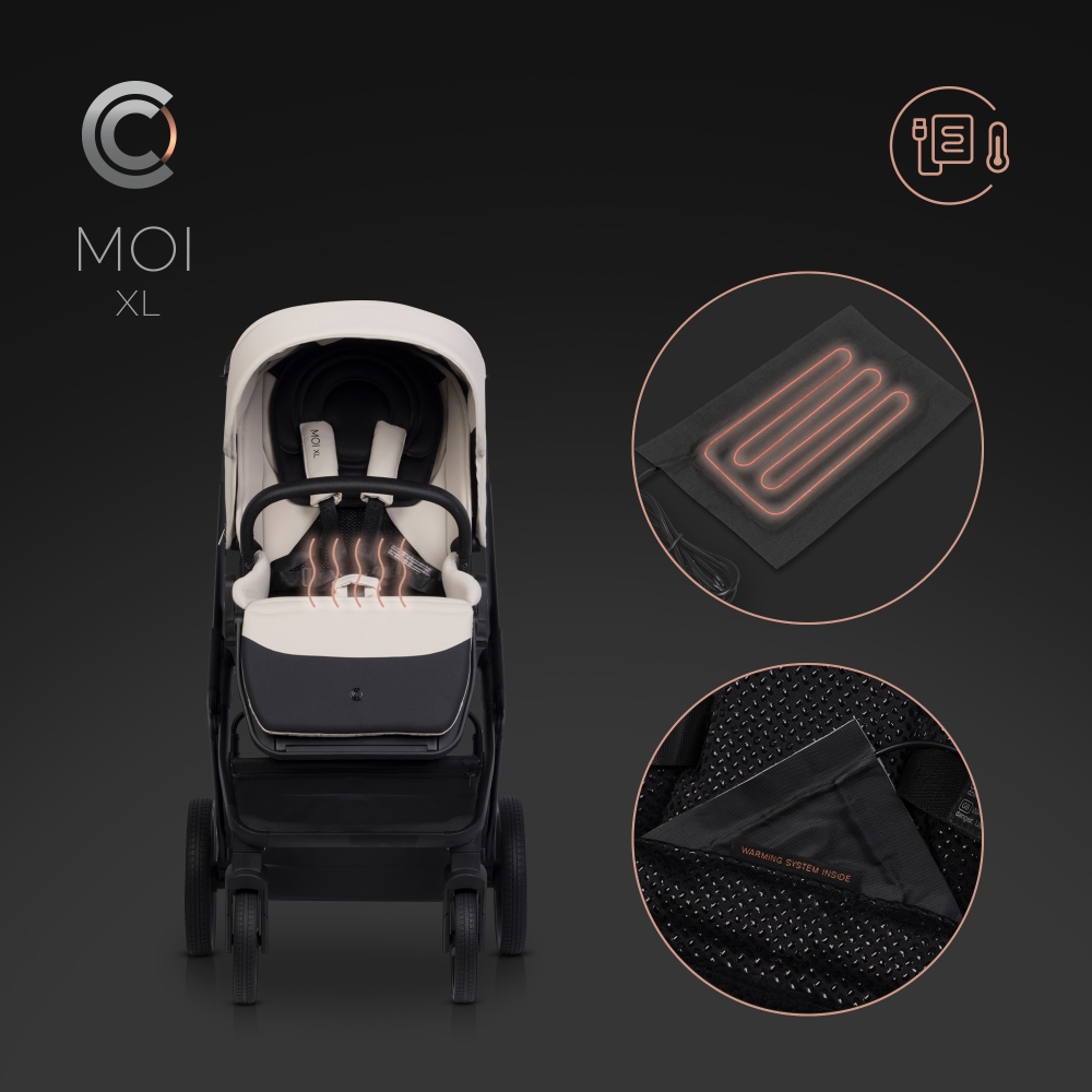 TOPNÝ SYSTÉM – Kočárek MOI XL je určen pro montáž topných panelů pomocí USB kabelu. Matrace korbičky a sedátko kočárku mají speciálně připravené kapsy, do kterých můžete umístit topné panely napájené powerbankami nebo jinými přenosnými nosiči energie s USB portem. Kočárek je vybaven speciálním pouzdrem na powerbanku, kterou lze nainstalovat na určená místa a připojit k němu USB kabel prostřednictvím systému průchodek použitých v čalounění kočárku. Topné panely jsou zcela bezpečné a v outdoorovém oblečení se používají již dlouhou dobu. Poskytují příjemné teplo a jsou ideální pro chladné měsíce. MOI XL je první kočárek, který tuto technologii využívá.