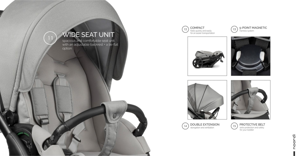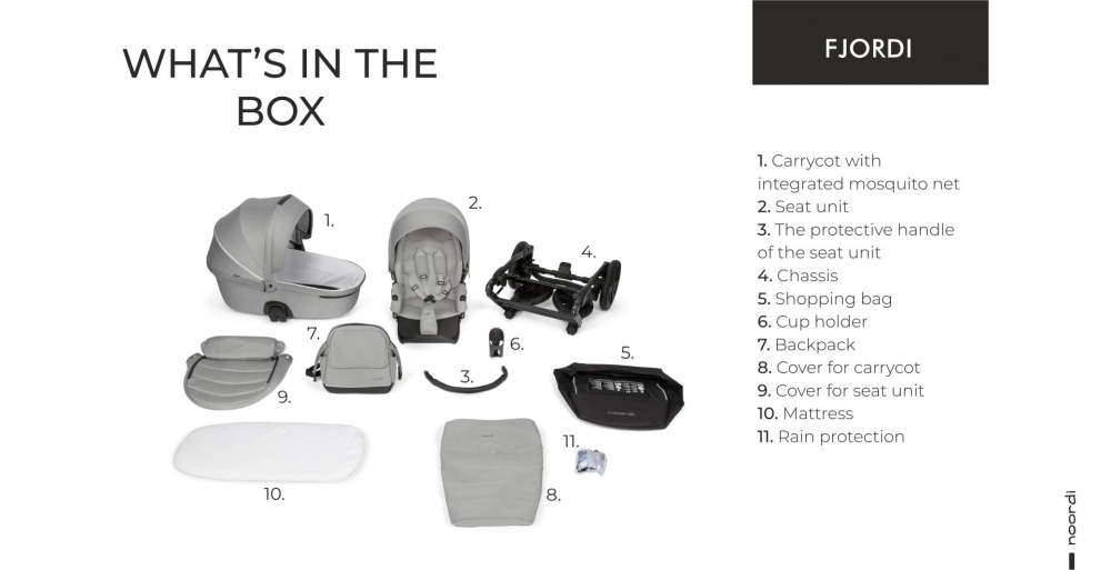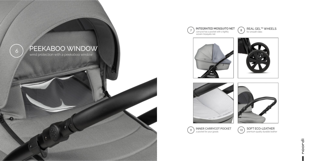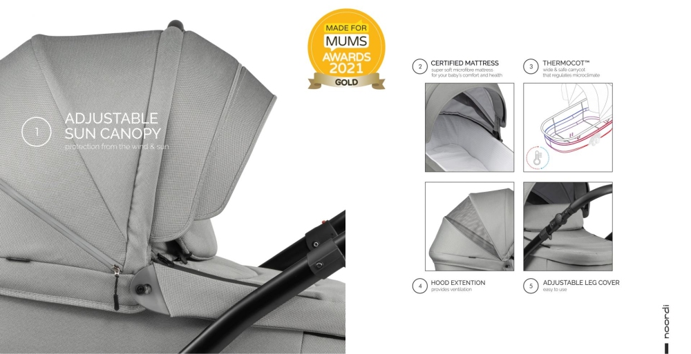 Čtvrtá generace kočárků Noordi Fjordi je zaměřena na pohodlí a pohodu dítěte za jakýchkoli povětrnostních podmínek. Ultralehká termální korbička ThermoCot ™ se stříškou i nánožníkem z voděodolné tkaniny dokonale chrání dítě před větrem i deštěm, aby i v případě nepříznivého počasí mohlo v teple a pohodlí v kočárku nerušeně spát či pozorovat svět kolem sebe. Brzdy se systémem One-Click ™, bezúdržbová plná kola a kvalitní systém odpružení všech kol zajišťují skvělé ovládání a hladkou jízdu kočárku i na náročných cestách.