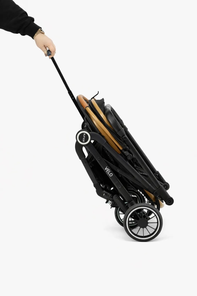 Kočárek je vybaven ergonomickou rukojetí potaženou ekokůží, která zajišťuje bezpečný úchop a pohodlné řízení. Kožená rukojeť nejen vylepšuje estetiku kočárku, ale také zvyšuje jeho odolnost a odolnost při každodenním používání.