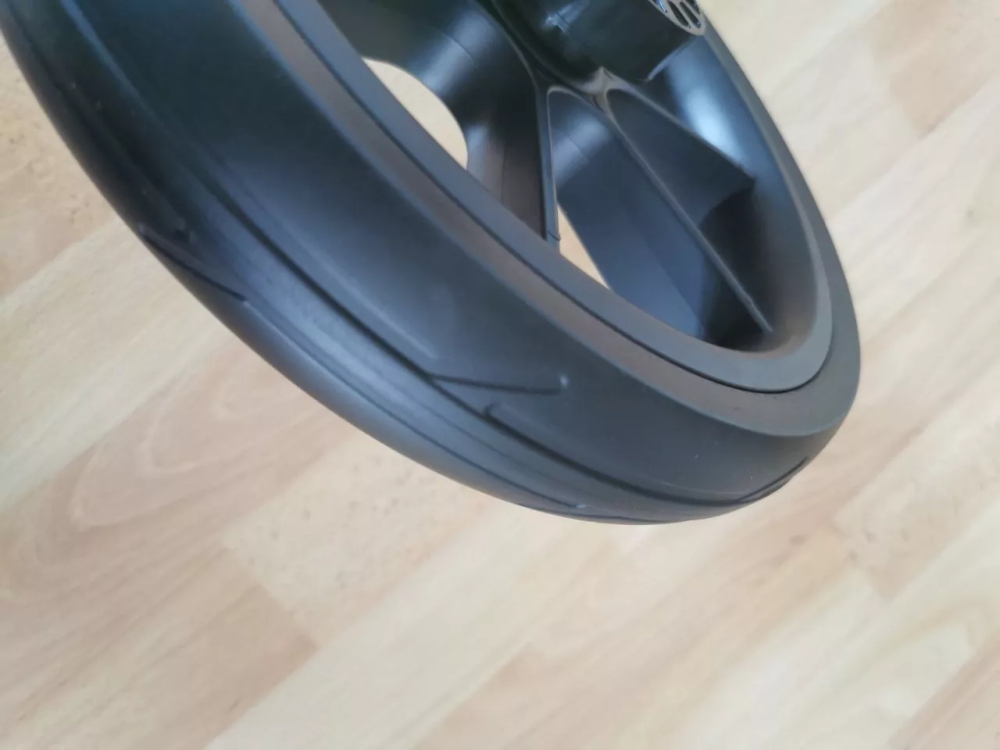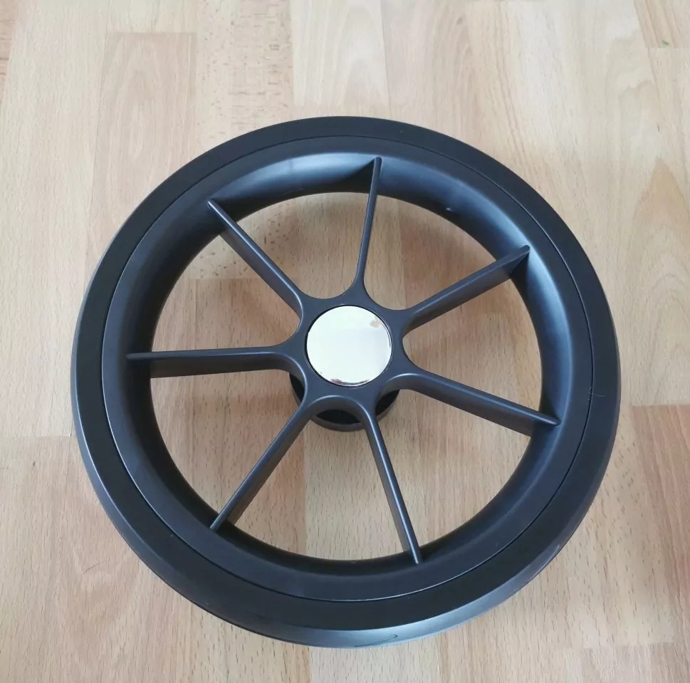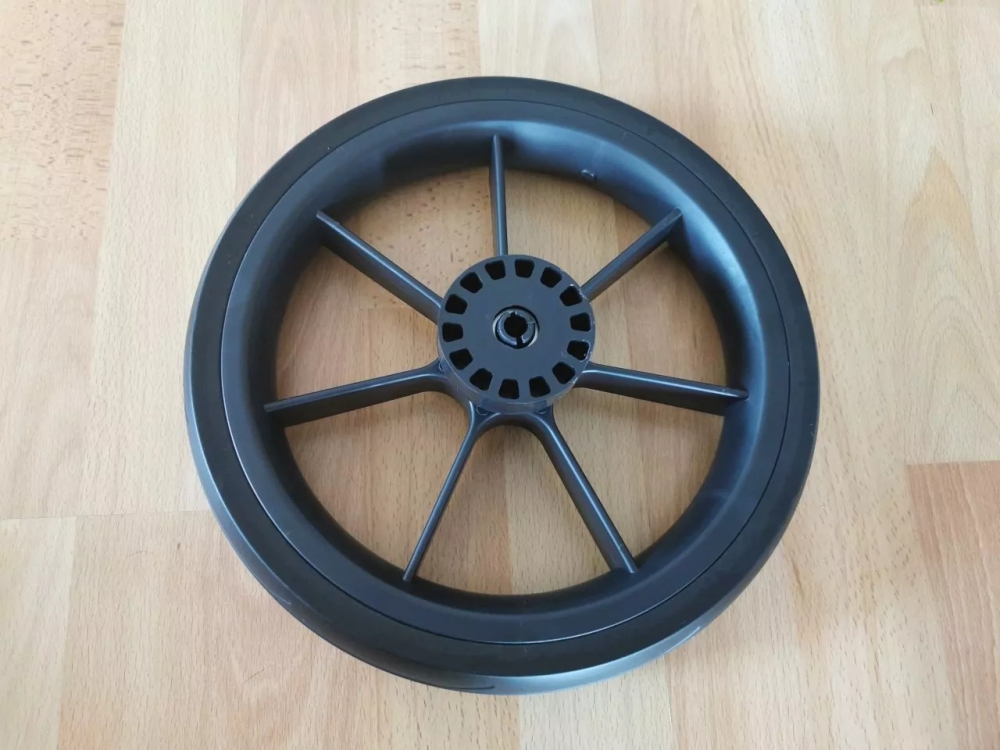 Plastový ráfek, polyuretan s dlouhou životností, kolo drží na osce kočárku pomocí ložiska. Průměr kolečka je asi 30 cm. Kolo pasuje na osku o průměru 10 mm a o délce min. 67 mm, včetně ozubeného brzdového kolečka