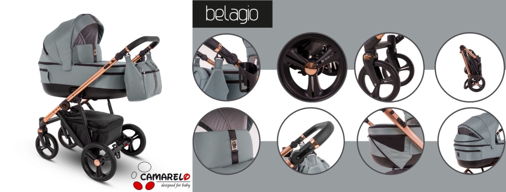 Dětský kočárek Camarelo Belagio je novinka od firmy Camarelo s možností nasazení dětské autosedačky (za příplatek), hluboké korby a sportovní části po i proti směru jízdy. Kombinovaný dětský kočárek Camarelo Belagio je vyroben z vysoce kvalitních materiálů, vyznačuje se velmi moderním designem a bohatým vybavením. Dětský kočárek Camarelo Belagio obsahuje hlubokou korbičku, sportovní část a umožňuje nasazení autosedačky ( autosedačka v neutrální černé barvě) na konstrukci. Hluboká korbička je vhodná od prvních dnů života dítěte do 6 měsíců, sportovní část pak od 6 měsíců do 3 let dítěte.