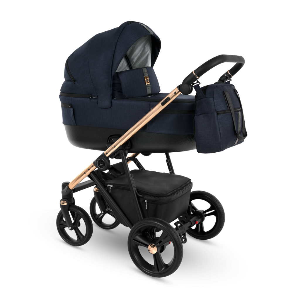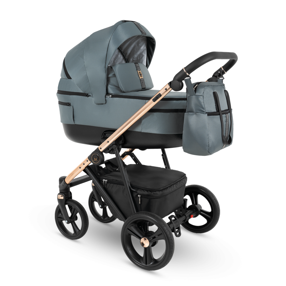 Součástí dětského kočárku Camarelo Belagio je: konstrukce s kolečky, hluboká korba s nánožníkem, sportovní část s nánožníkem, taška na rukojeť s pláštěnkou a moskytierou a nákupní košík.