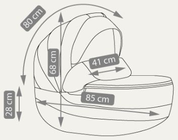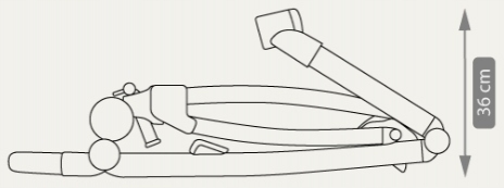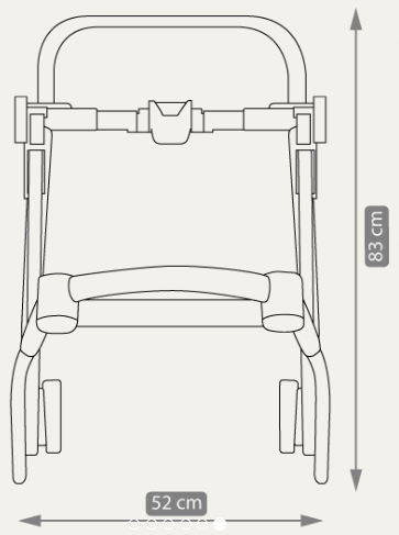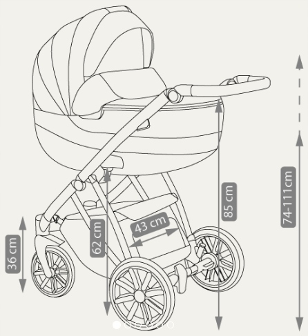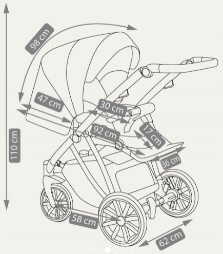 Rozměry: vanička-vnitřní část 86 cm x 38 cm, vanička-vnější část 88 cm x 42 cm (d,š), délka sportovní části 100 cm, nastavitelná rukojeť 74 cm-111 cm, složená konstrukce s koly 82 cm x 60 cm x 30 cm (d,š,v)