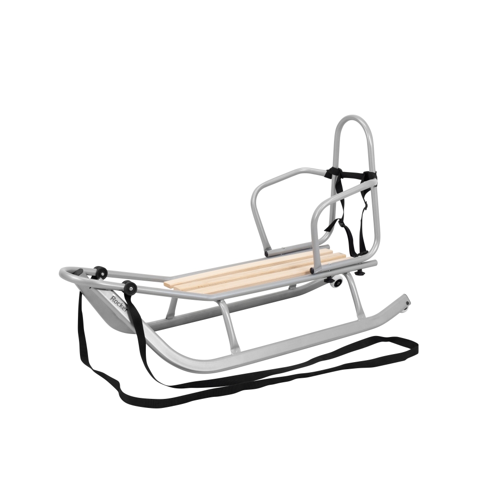 Ocelové sáňky s dřevěným sedátkem, s odnímatelnou opěrkou zad a tlačným madlem. Součástí jsou kolečka pro snadné přenášení.