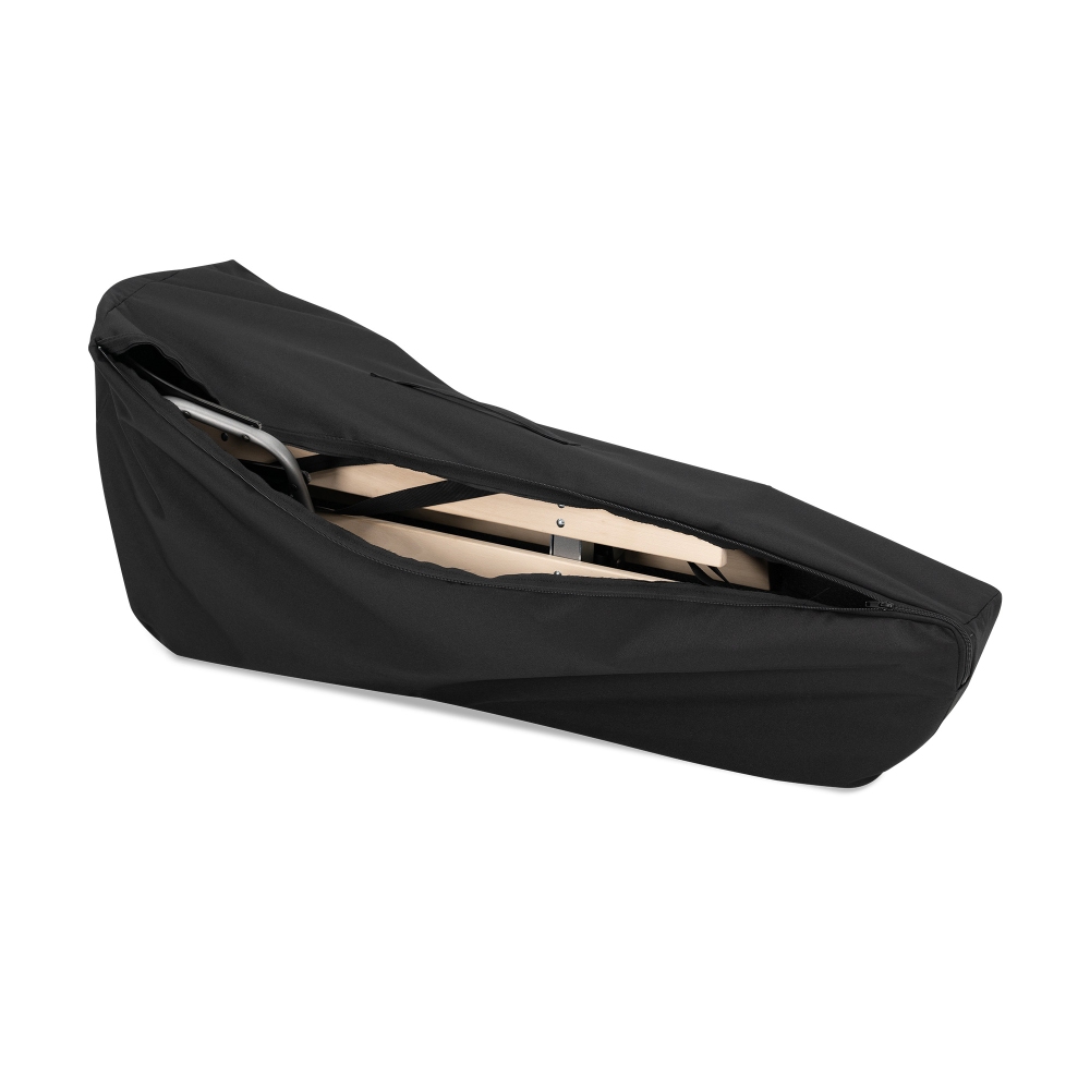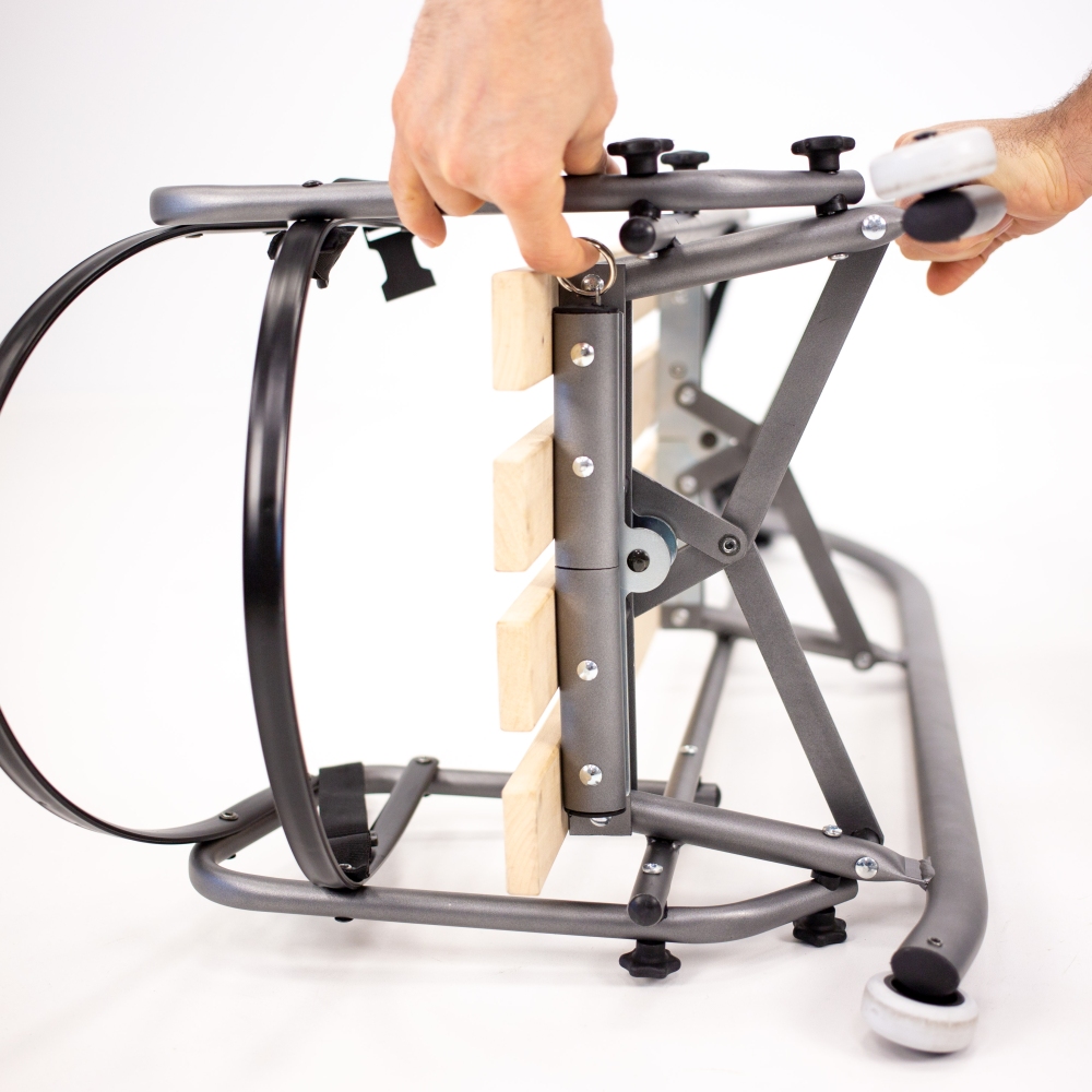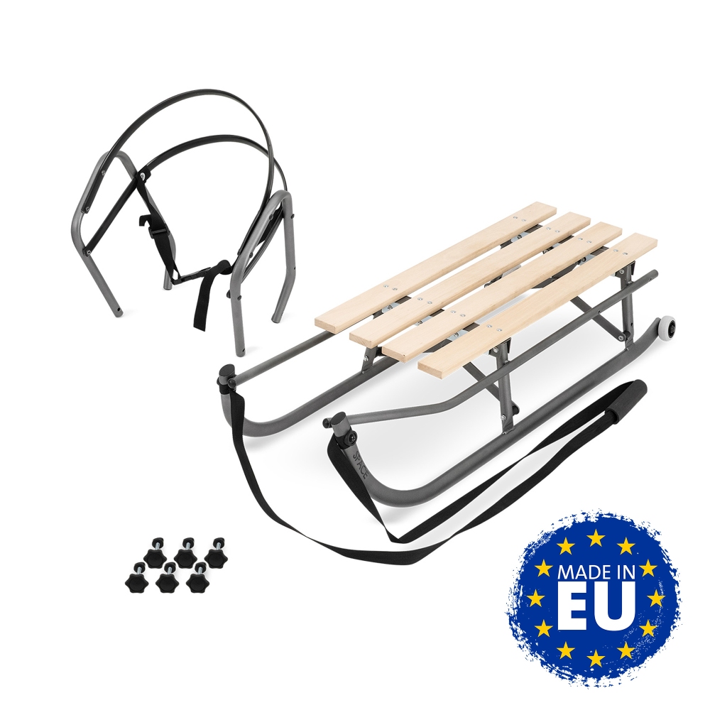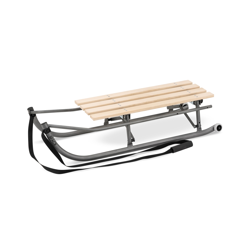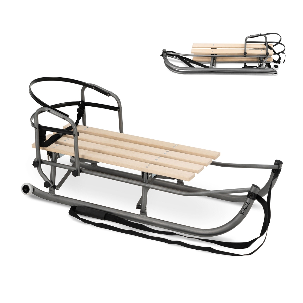 Ocelové sáňky s dřevěným sedátkem, s odnímatelnou opěrkou zad a snadným složením.